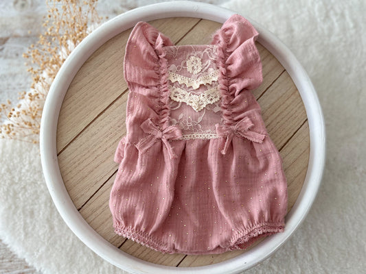 Pink Newborn Girl Romper - Muslin Lace Newborn Photo Outfit