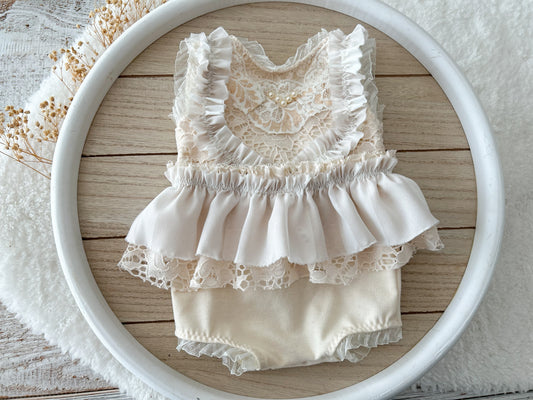 Lace Newborn Romper for First Photo Shoot - Cream Ruffled Girl Outfit