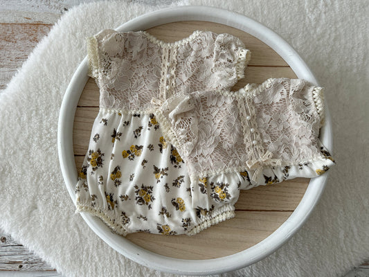 Newborn Romper with Vintage Lace and Yellow Floral Print – Handmade Photo Prop